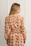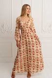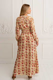 One of the favourites of all times, meet the Amaretto Maxi ~ a masterpiece that seamlessly weaves together sophistication and elegance, adorned with captivating hand-drawn floral motifs and pops of vibrant roses against a cream base. This beauty features elegant cropped out details throughout the sleeves and back in beige threads, ethereal high waist band and button front, as well as elasticated back to accent your figure and fit you perfectly. Crafted in a soft luxe crepe, Amaretto Maxi will become your new favorite lounging, party or event companion, simply beautiful and chic, you will glow in it and get compliments in every step. Pair it with fine golden jewelry and wedges for a chic look.