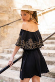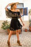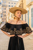 Our spectacular Anabella Off The Shoulder Dress with its frill overlay along the neckline and elastic waistline has a feminine and elegant twist. One of a kind, it features intricate handcrafted gold embroidery and cropped out design. For a bohemian-chic touch we added a tasselled embroidered belt that well accents your figure. Wear it off or on shoulder and with sandals for a casual look or fine golden jewelry and heels for an afternoon soirée with friends.