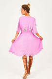 This flowy ethereal midi has a chic bohemian feel featuring pastel lilac floral embroidery allover and decorative buttons down the front for a feminine look. One of a kind, Belleza Midi features handcrafted cropped out detailing on the front waistline and sleeves, delicate hidden elastic at the back for perfect fit and feminine scalloped hem. Perfect to pair it with sandals for an afternoon with friends or add tanned wedges for a night out! Side pockets.