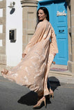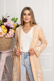 Our glamorous Chanel Kimono Duster in nude luxe fabrication is fully embroidered in delicate cream color, inspired by Zaimara signature bird design and wildlife. Designer favorite kimono of all times, this piece is a head turner and adds incredible depth to any outfit. With an elegant fixed waistband and cut out technique all over, it will take you from glamorous sunset soiree with friends into a special event where you want to glow.