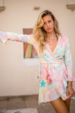 Divinity and elegance meet in our spectacular Chania mini wrap, hand dyed in a perfect combination of cotton candy pastels, inspired by our magical Mediterranean sea and its glorious marine wildlife. Crafted in a luxurious rayon, this mini features the well-known Zaimara signature cutout detailing throughout, high quality embroidery design, pretty flared sleeves and ruffled hems giving it a beautiful swish as you walk. To finish off this cutie, we have designed at the back a gorgeous dreamcatcher in traditional crochet technique featuring the phrase "You are magic" to spread positivity and love everywhere you go!