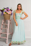 Float, glide or swish, this design is romantic, feminine and certainly one for the collectors. Our newest silhouette comes in aqua green color featuring smoked back to fit you seamless, beautiful tie strings and breathtaking embroidery design on the chest area and hems. You will absolutely adore the feel of the crepe fabric and the movement in every step. Pair it with golden hoops and heels for a night out or wear it with wedges and a straw bag for an afternoon soiree with friends.