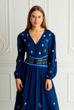 Crafted in the most beautiful linen blend fabrication, this pretty dress has evil eye embroidery design throughout and pretty hummingbird details on the upper sleeves. Ideal for any occasion, this maxi comes with chic high empire waist and elasticated backside to fit easily and flatter any figure.