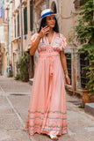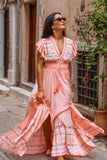 A dreamy silhouette, Monaco Maxi in pastel peach color is the ultimate summer dress. This beauty features stunning details at the neckline crafted in our traditional cut out technique adding a touch of sophistication and feminine flair. With cute little ruffle sleeves for a dimensional effect, delicate embroidery throughout and smocked waist to fit you comfortably (stretches up to 12cm). Soft and floaty, it features chic high splits at the front of each leg, giving it a beautiful swish as you walk. Pair it with some strappy heels and gold hoops for the perfect party fit or with flats and a clutch for all those upcoming summer soirees.