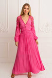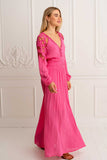 Become a Mediterranean goddess in our Penelope Maxi in Magenta with elegant cropped out details throughout the sleeves and back. Stunning from any angle featuring an ethereal high waist band and button front, as well as elasticated back to accent your figure and fit you perfectly. Crafted in a soft luxe crepe, Penelope Maxi will become your new favorite lounging, party or event companion, simply beautiful and chic, you will glow in it and get compliments in every step. Pair it with fine golden jewelry and wedges for a chic look.