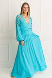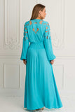 Become a Mediterranean goddess in our Savannah Maxi in Aqua color with elegant cropped out details throughout the sleeves and back. Stunning from any angle featuring an ethereal high waist band and button front, as well as elasticated back to accent your figure and fit you perfectly. Crafted in a soft luxe crepe, Savannah Maxi will become your new favorite lounging, party or event companion, simply beautiful and chic, you will glow in it and get compliments in every step. Pair it with fine golden jewelry and wedges for a chic look.