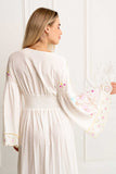 Sevilla Gown in ivory color is a romantic masterpiece on its own. So much detail has gone into creating this stunning design including an elegant empire waist and fabric covered button up silhouette, elasticated back to fit well all body shapes and embroidered cool bell sleeves. This gorgeous button-up can be worn also open as a layering piece adding an incredible depth to any outfit. Pair this beauty with tan slides and fine jewelry for an afternoon soiree with friends.