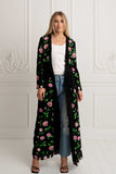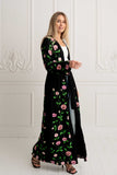 So billowy and ethereal, Sweet Roses Kimono Duster in black is the essential kimono jacket you are needing this Fall season. Our embroidery design is inspired by one of the most majestic and elegant flowers, roses, a symbol of love, passion and joy, a sweet reflexion of how we want you to feel when you wear it.  Effortlessly beautiful with endless styling options, it features fixed waistband, handcrafted scallop hems, long sleeves and is fully lined to add an extra warm layer. Pair it with your favourite denims or leggings and boots for those chilly autumn days. Get ready to receive compliments in every step!