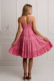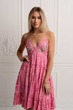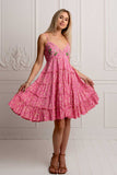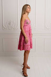 Your new go-to slip dress in magenta-vanilla hand block print features cute embroidery design on the bust, cut out details and adjustable straps. Romantic and feminine, it has a smocked stretchy back and panels sewn inside out to create a flirty flow as you walk. You will love the feel and comfort of wearing this beauty on a hot summer day.