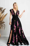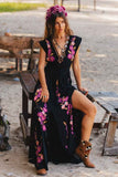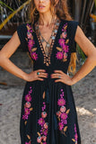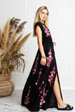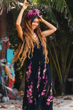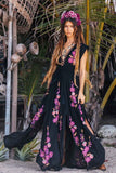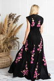 Make an entrance in this breathtaking black gown with precious handcrafted crochet detailing at the neckline and colorful wildflowers embroidery throughout.