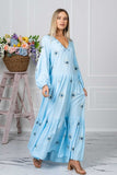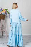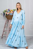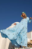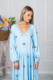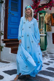 Calling all evil eye lovers! Our stunning gown in soft blue color comes fully embroidered with evil eyes motifs to protect you from bad energies and keep you enlightened as it is believed in the Mediterranean countries. Designed to perfectly fit all beautiful body shapes, our Evil Eye Gown is the ultimate throw on wardrobe staple. Pair it with slides and some fine gold jewelry for a relaxed look or add a slim heel for a night out.