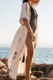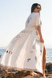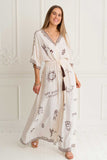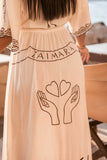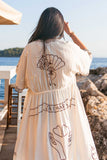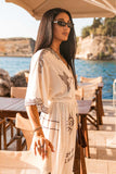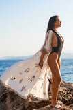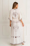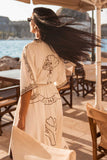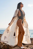 Meet the mesmerising Fairyland Kimono Maxi - a masterpiece that seamlessly weaves together boho-chic vibes and elegance, adorned with stunning embroidered drawings inspired by our mother nature and heartwarming phrases such as familia and art over luxury.