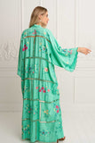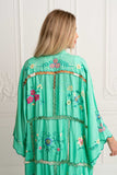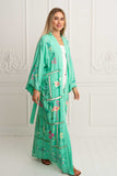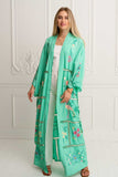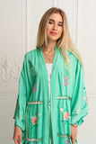Our designer spent over a month working on this masterpiece, creating over 30 panels of different embroidered floral motifs and colourful flamingos. All the panels are assembled by our traditional crochet technique creating a delicate a see-through lace that adds a sophistication and feminine flair in every step. Make it your perfect resort-wear statement piece to throw over a bikini or swimsuit while you walk the magnificent coastlines of Miami and Saint Tropez or dress it up with denims and slim heel for a night out with friends. Comes with an adjustable belt and glamorous kimono inspired sleeves.