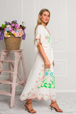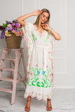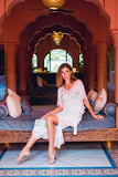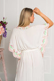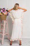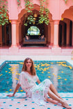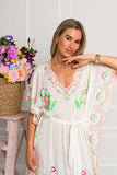 For the kaftan lovers here is the ultimate most beautiful silhouette in crepe fabric. Crafted and drawn entirely by hand, this masterpiece features floral embroidery design throughout and cut out design on the neckline, borders and hem. You will absolutely adore the way it falls and moves when you walk. Make it your perfect resort-wear statement piece to throw over a bikini or swimsuit while you walk the magnificent coastlines of Miami and Saint Tropez or dress it up with a slim heel for a night's soiree with friends.