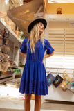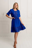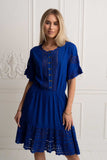 For those looking for elegance and comfort meet the breathtaking new silhouette Icaria Midi in cobalt blue colorway. An absolute piece of art, fully handcrafted using our cut work technique and hand drawn embroidery design taking up to 4 weeks just to create one piece. With antique bronze hooks on bust closure and elasticated waist, it falls on the body to absolute perfection, get ready to receive compliments in every step.