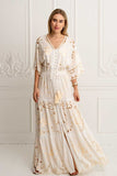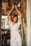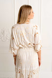 Meet the mesmerising Isla Kimono Dress in Ivory ~ a masterpiece that seamlessly weaves together sophistication and elegance, adorned with floral embroidered motifs contrasting in beige and our signature cut out work that creates delicate lace details throughout. Crafted from luxurious soft rayon our Isla Dress is captivating, a structural marvel designed to embrace your every move with grace.