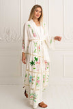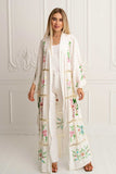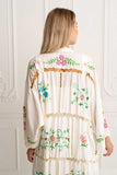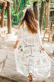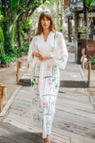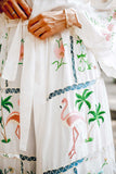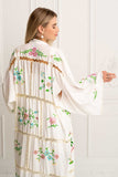 Our designer spent over a month working on this masterpiece, creating over 30 panels of different embroidered floral motifs and colourful flamingos. All the panels are assembled by our traditional crochet technique creating a delicate see-through lace that adds a sophistication and feminine flair in every step. Make it your perfect resort-wear statement piece to throw over a bikini or swimsuit while you walk the magnificent coastlines of Miami and Saint Tropez or dress it up with denims and slim heel for a night out with friends. Comes with an adjustable belt and glamorous kimono inspired sleeves.