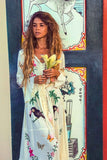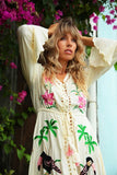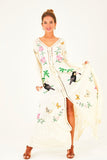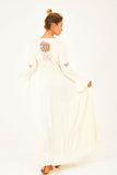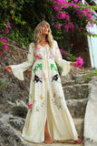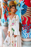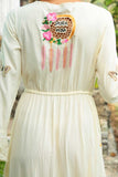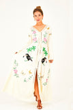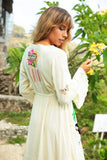 A real show stopper, our ethereal kimono maxi dress is fully handcrafted featuring cut out details and tropical fauna inspired embroidery design. Made from a soft and semi sheer rayon, this button-down design can be worn closed as a dress during warm summer days or open as a throw on kimono for cooler months. This beauty features drawstring tasseled tie closure to flatter any figure and high split at the front giving it a beautiful swish as you walk. It comes with a killer detail at the back – a delicate dreamcatcher in a traditional crochet technique with a phrase “Pura Vida” – to spread good vibes everywhere you go!
