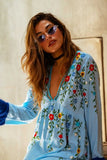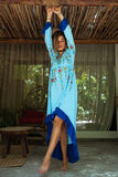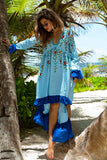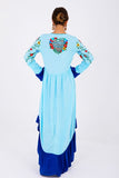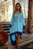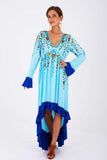 Become a Mediterranean goddess in this Santorini High Low Dress in an ethereal combination of celeste and royal blue colors, featuring handcrafted crochet detailing at the neckline and colorful wildflowers embroidered throughout. Flirty and chic, this long sleeves dress is accented with a cascading ruffled trim that allows you to show off your favorite tan slides. Putting you in the centre of attention in every step, it comes with a killer detail at the back - a delicate heart in a traditional crochet technique with a phrase “Bring Your Own Sunshine” - to spread your light everywhere you go!
