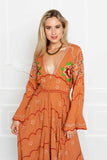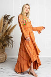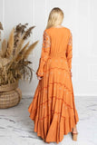 Stun in this undeniably gorgeous high low in elegant caramel color, fully handcrafted featuring beautiful embroidery and cut out detail design throughout.