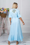 A real show stopper, our Zaimara signature wrap dress in Mediterranean blue is fully handcrafted featuring cut out details and tropical fauna inspired embroidery design throughout. Crafted in a luxurious rayon, this maxi features pretty flared sleeves and ruffled hems giving it a beautiful swish as you walk.