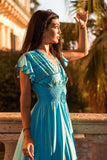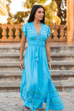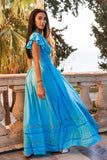 A dreamy silhouette, Ibiza Maxi in acquamarine blue color is the ultimate summer dress. This beauty features stunning details at the neckline crafted in our traditional cut out technique adding a touch of sophistication and feminine flair. With cute little ruffle sleeves for a dimensional effect, delicate embroidery throughout and smocked waist to fit you comfortably (stretches up to 12cm). Soft and floaty, it features chic high splits at the front of each leg, giving it a beautiful swish as you walk. Pair it with some strappy heels and gold hoops for the perfect party fit or with flats and a clutch for all those upcoming summer soirees.