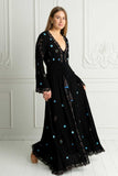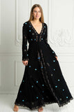 Become a Mediterranean goddess in our Crete Maxi fully embroidered with evil eyes motifs to protect you from bad energies and keep you enlightened as it is believed in the Mediterranean. Crafted in a soft luxurious crepe fabric that brings beautiful texture and elegance in every step. This beauty comes with stretchy smocked band (that stretches up to 12cm), button up silhouette and long sleeves. Truly a bohemian and free-spirited dress, it will take you from afternoon cocktails with friends to special evening out.