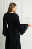 One of your favourite designs and silhouettes now in black color! So much detail has gone into creating this stunning design including an elegant empire waist and fabric covered button up silhouette, elasticated back to fit well all body shapes and embroidered cool bell sleeves. This gorgeous button-up can be worn also open as a layering piece adding an incredible depth to any outfit. Pair this beauty with tan slides and fine jewelry for an afternoon soiree with friends. Available in petite and extra large sizes.