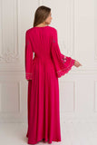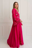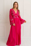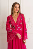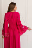 Rosalia Gown in alluring Carmine color is a romantic masterpiece on its own. Inspired by one of the most beloved and favourite flowers of our designer, the rose. So much detail has gone into creating this stunning design including an elegant empire waist and fabric covered button up silhouette, elasticated back to fit well all body shapes and embroidered cool bell sleeves. This gorgeous button-up can be worn also open as a layering piece adding an incredible depth to any outfit. Pair this beauty with tan slides and fine jewelry for an afternoon soiree with friends.