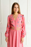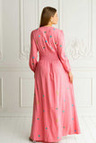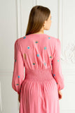 Crafted in the most beautiful linen blend fabrication, this pretty dress has evil eye embroidery design throughout and pretty hummingbird details on the upper sleeves. Ideal for any occasion, this maxi comes with chic high empire waist and elasticated backside to fit easily and flatter any figure.