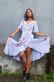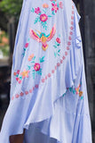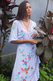 Romance, bohemian and beauty all meet in this luxe Antibes maxi wrap dress. This maxi features birdlife inspired embroidery with handcrafted cut out details throughout, pretty flared sleeves and ruffled hems giving it a beautiful swish as you walk. Super easy to wear, this wrap dress comes with a gorgeous “good vibes” dreamcatcher detail at the back to spread love anywhere you go!